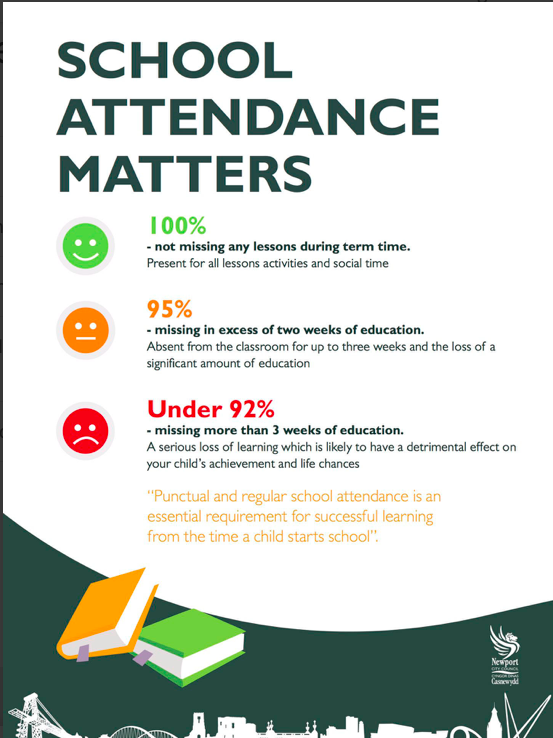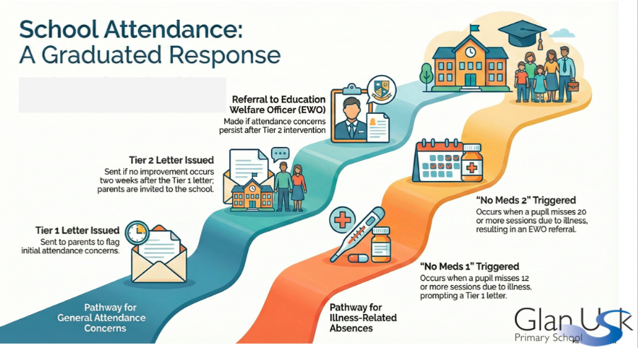 We know that good attendance plays a vital role in helping children feel settled, confident and ready to learn. At Glan Usk Primary School, we work closely in partnership with families to support pupils to attend regularly, arrive on time and get the most from each school day.